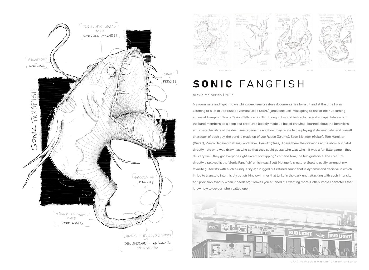 A deep-sea daydream turned jam-band tribute, Sonic Fangfish began as Alexis Malnerich’s way of capturing the spirit of Joe Russo’s Almost Dead through imagined ocean creatures. This particular predator, inspired by guitarist Scott Metzger, blends sly elegance with sudden, precise ferocity—just like his playing. We put it on a shirt because it lives exactly where music and art meet: a visual rhythm, a sonic bite, and a reminder that sound can be seen as much as it’s heard.